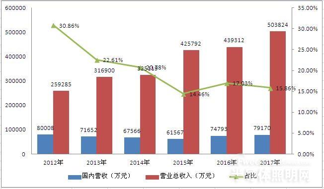 从近几年阳光照明的业绩中看,其LED光源占总营业收入的比例一直都在增加,从2012年的14%、2014年的49.94%、2017年的89.37%一直在快速增长。可以看出,阳光照明近几年一直都在朝LED方向转换产品线。同时LED所带来的巨大市场,也成为其近几年业绩快速增长的主要推力。 传统光源业务板块在不断缩减,从2014年开始,阳光照明已经不把“一体化电子灯”、“T5大功率荧光灯及配套灯具”、“特种灯具”产品纳入业绩的统计范围。阳光照明从1996成立以来,一直都是以大批量的生产“一体化电子灯”、“节能荧光灯管”、“T5大功率荧光灯及配套灯具”等产品为主。近几年,伴随着LED市场的快速崛起,以往的大部分传统光源已经停止生产销售,这其实也反映近几年LED技术发展,给行业带来了巨大产品的变革。 然而,随着LED照明技术发展迅速,成本快速下降,节能减排效果明显,LED照明被消费者普遍接受,LED照明应用渗透率不断提高,相对应的则是传统照明市场快速萎缩,但是LED照明经过近几年的快速发展与替换后,LED照明发展速度放缓,尤其是门槛不高的LED下游应用领域,存在着较明显的结构性产能过剩问题,并由此导致了市场的无序、恶性竞争,在宏观经济下行压力及激烈竞争的双路夹击下,大企业将通过并购重组进行扩张,增强市场竞争力,部分缺乏市场竞争力的中小企业将逐步退出,整个行业进入整合阶段。 收入增长主要来自海外,国内业务仍在转型调整期 阳光照明自成立以来,一直都是以海外出口业务为。虽然近几年,阳光照明一直都在强调深耕国内渠道,但其2012年到2017年这几年期间国内营业额数据显示,其国内销售占比从2012年的30.86%下跌到2017年的15.86%,国内营收也从8亿元下降到7.917亿元。总的来说,近几年阳光照明的营业重心,主要还是放在海外市场方面。