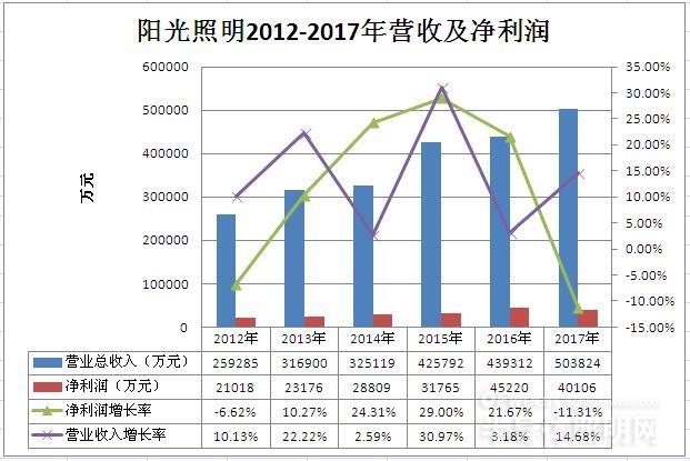阳光照明2017年营收超50亿 向LED智能化制造转型导读: 4月16日,阳光照明发布2017年度报告。报告期内,公司实现销售收入50.38亿元,同比增长14.68%;归属于上市公司股东的净利润4.01亿元,同比下降11.31%。 4月16日,阳光照明发布2017年度报告。报告期内,公司实现销售收入50.38亿元,同比增长14.68%;归属于上市公司股东的净利润4.01亿元,同比下降11.31%。其中,LED光源及灯具产品收入45.03亿元,同比增长22.58%,销量3.74亿只(套),同比增长39.03%;节能灯光源及灯具产品收入4.90亿元,同比下降25.53%,销量0.73亿只(套),同比减少12.05%。